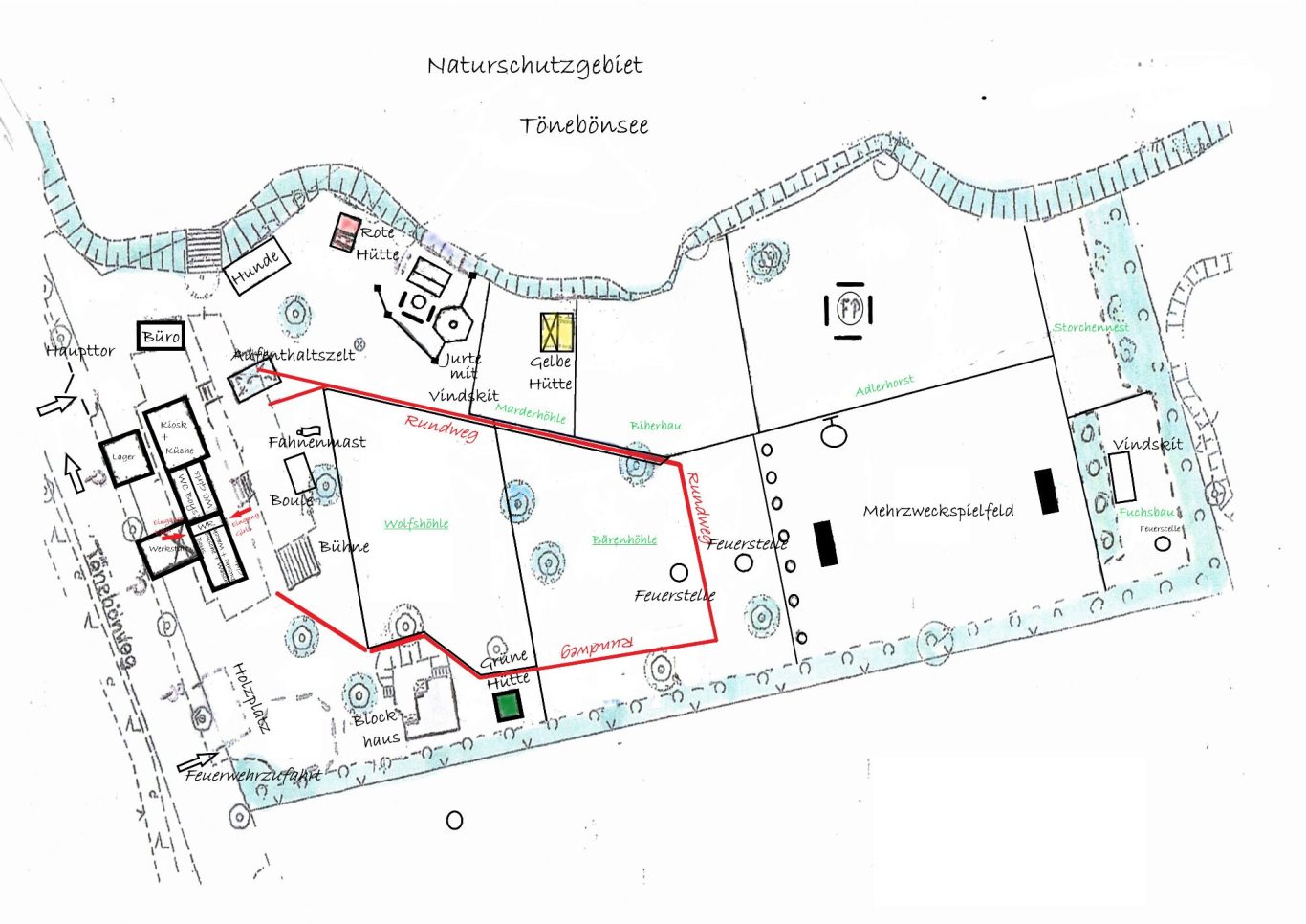 Ein ruhiger und geschützer Platz hinter Brombeerhecken für bis zu 20 Personen. Er bietet eine schöne Feuerstelle mit Vindskydd und lässt sich ideal mit dem Storchennest für Schlafzelte kombinieren.